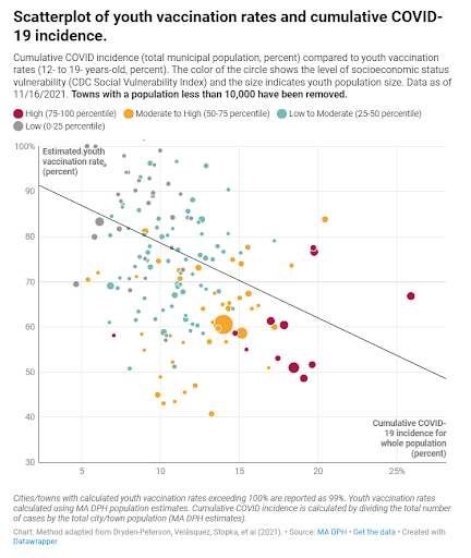 BOSTON – Today the Vaccine Equity Now! Coalition is releasing a new data visualization in partnership with Boston Indicators that depicts the inequities in COVID-19 vaccination rates among 12-19 year olds in Massachusetts. Overall, the scatterplot shows that many communities with higher cumulative incidences of COVID-19 and higher social vulnerability ratings have lower rates of vaccination among 12-19 year olds. Conversely, many communities with lower incidences of COVID and lower social vulnerability ratings have higher rates of vaccination among 12-19 year olds.